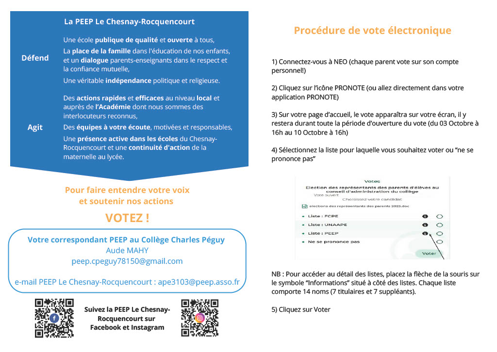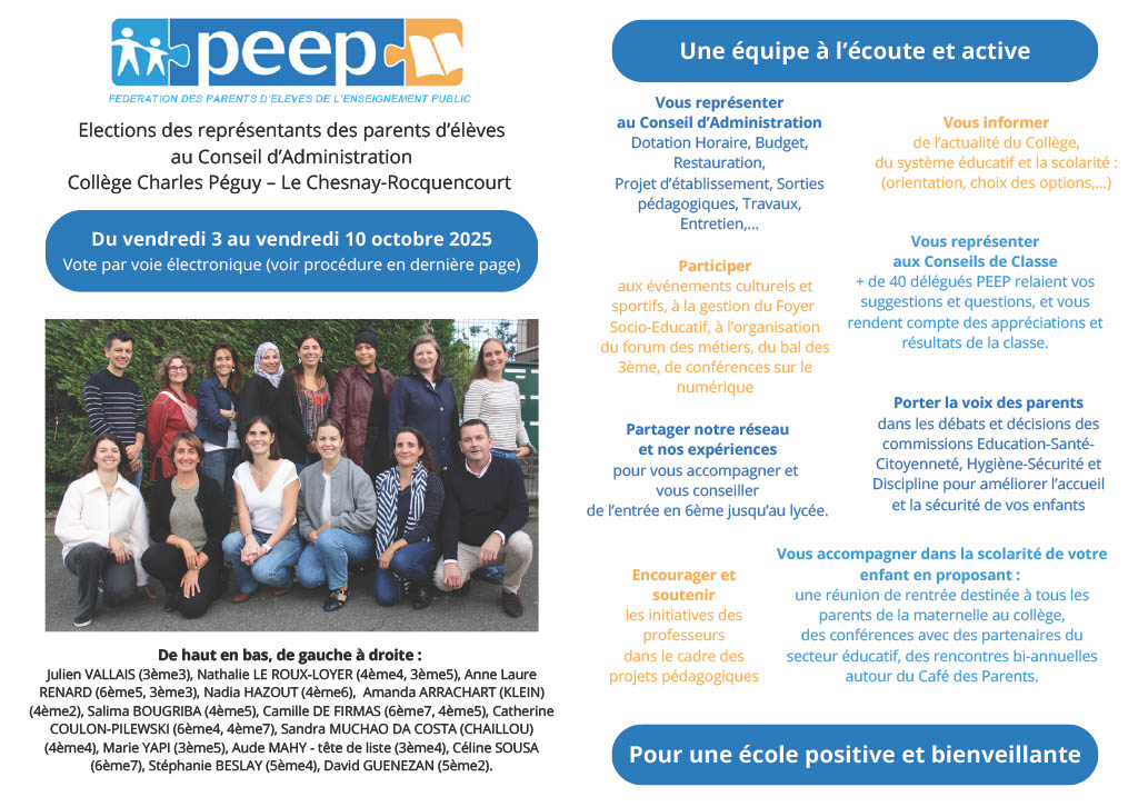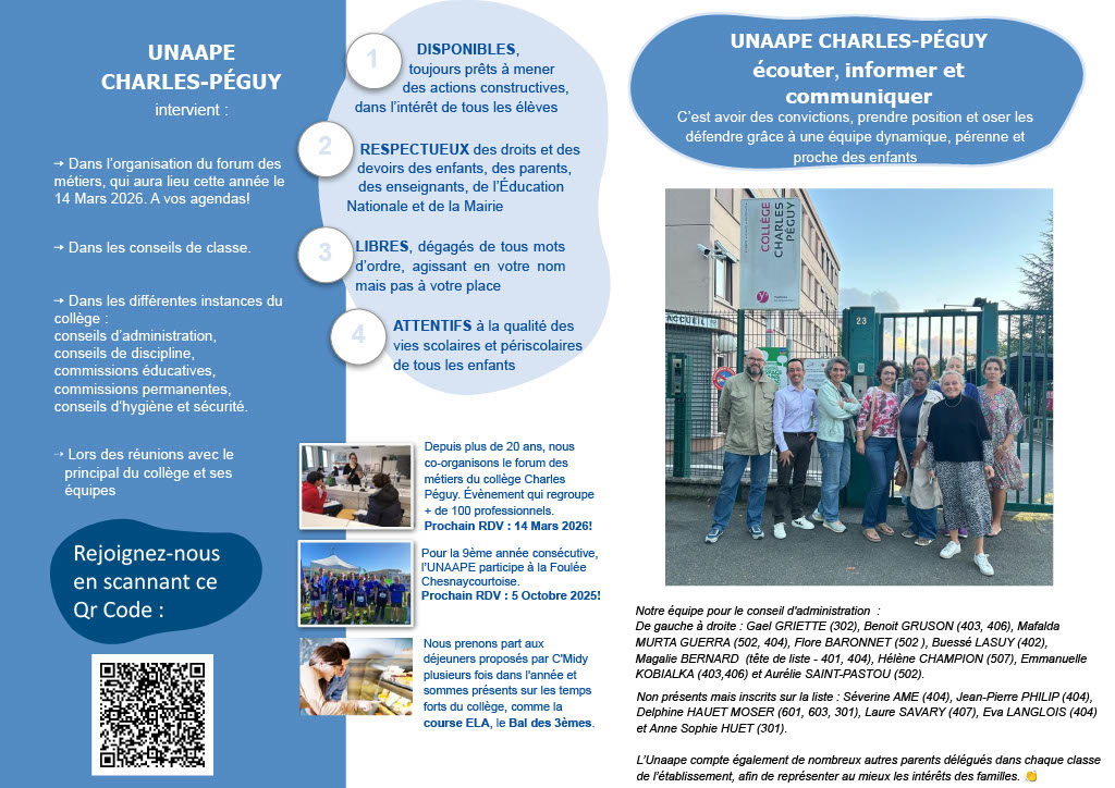 Au collège, deux associations de parents d’élèves, la PEEP et l’UNAAPE, sont présentes pour vous représenter auprès des équipes administratives et éducatives du collège.